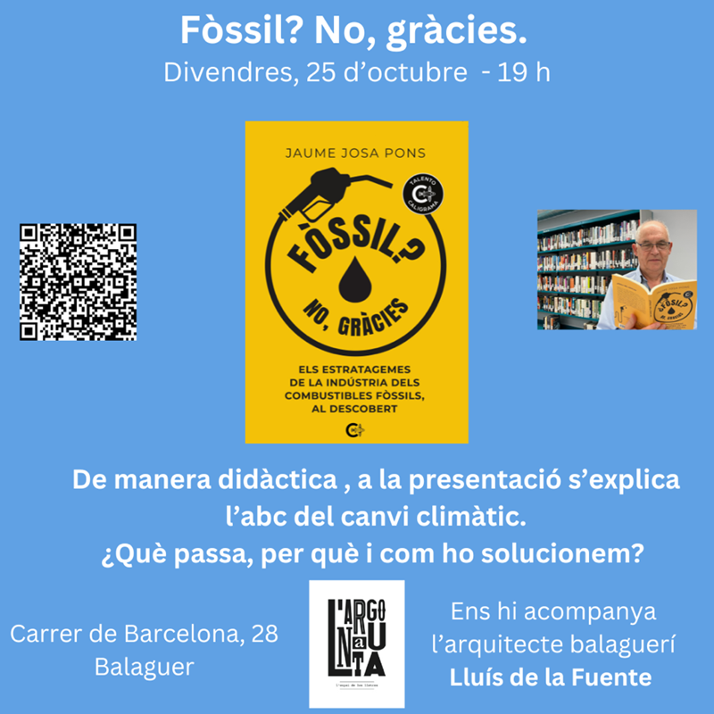 Aquest divendres, dia 25, a les 19:00, rebrem al nostre espai el Jaume Josa, que amb la companyia del Lluís de la Fuente presentarà el seu llibre "Fòssil? No, gràcies". Durant aquesta estona compartida, el Jaume ens parlarà a través de la seva obra sobre el sentit dels diversos tipus d'energia amb els seus avantatges i perjudicis, tot des de la perspectiva d'una crisi climàtica que ja se'ns ha tirat a sobre i que cada cop s'agreuja més i es fa més real per molt que en desviem la vista.